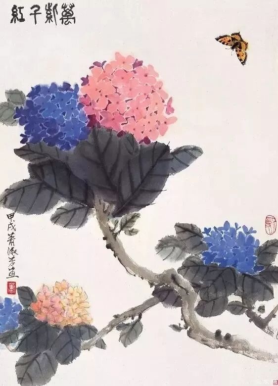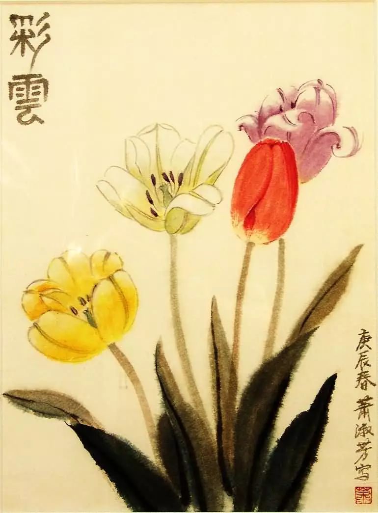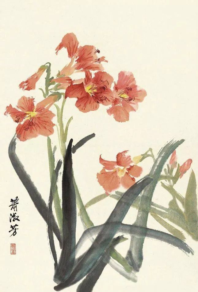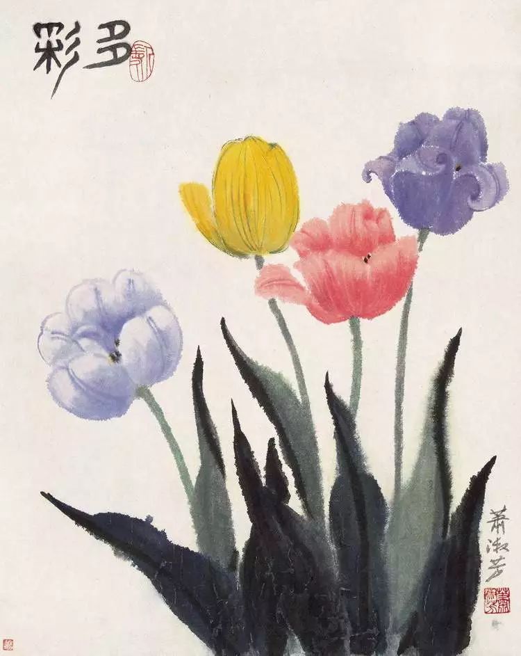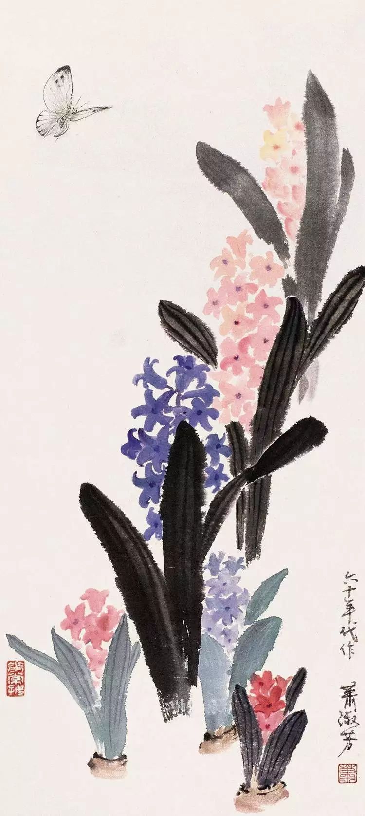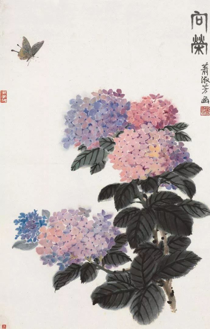 萧淑芳的花卉画在题材选取上极具个性,她喜欢画的花卉大约有四五十种,如紫鸢、绣球、兰草、水仙、杜鹃、虞美人、扶桑、向日葵、紫丁香等,几乎全是野花。她以花卉画作享名于世,号称“百花之神”。